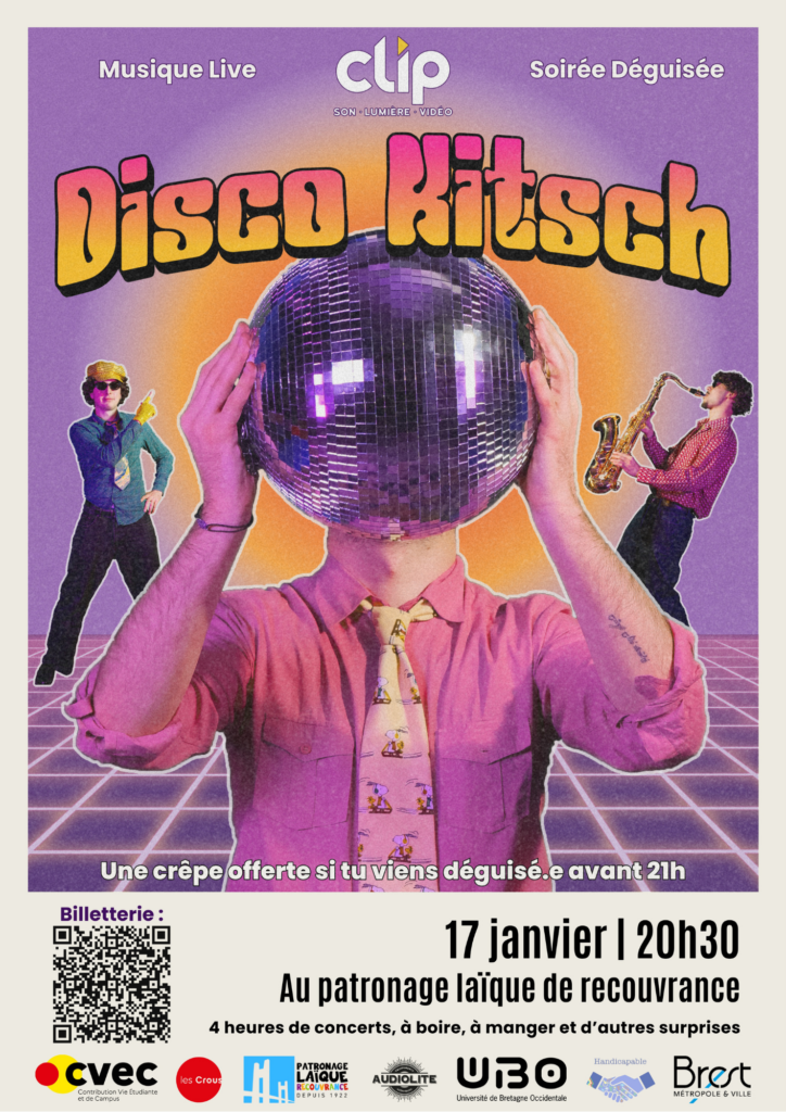 L’association étudiante CLIP vous invite le 17 janvier 2026 au Patronage Laïque de Recouvrance à sa soirée annuelle kitsch, édition Disco Kitsch ! 🪩 Au programme : trois concerts de reprises cultes et un show de danse. Vestiaire sur place et crêpe offerte aux personnes déguisés arrivant avant 21h. N’hésitez pas à réserver vos places à l’avance : 5€ sur HelloAsso, contre 7 € sur place. Et sortez les paillettes ✨!